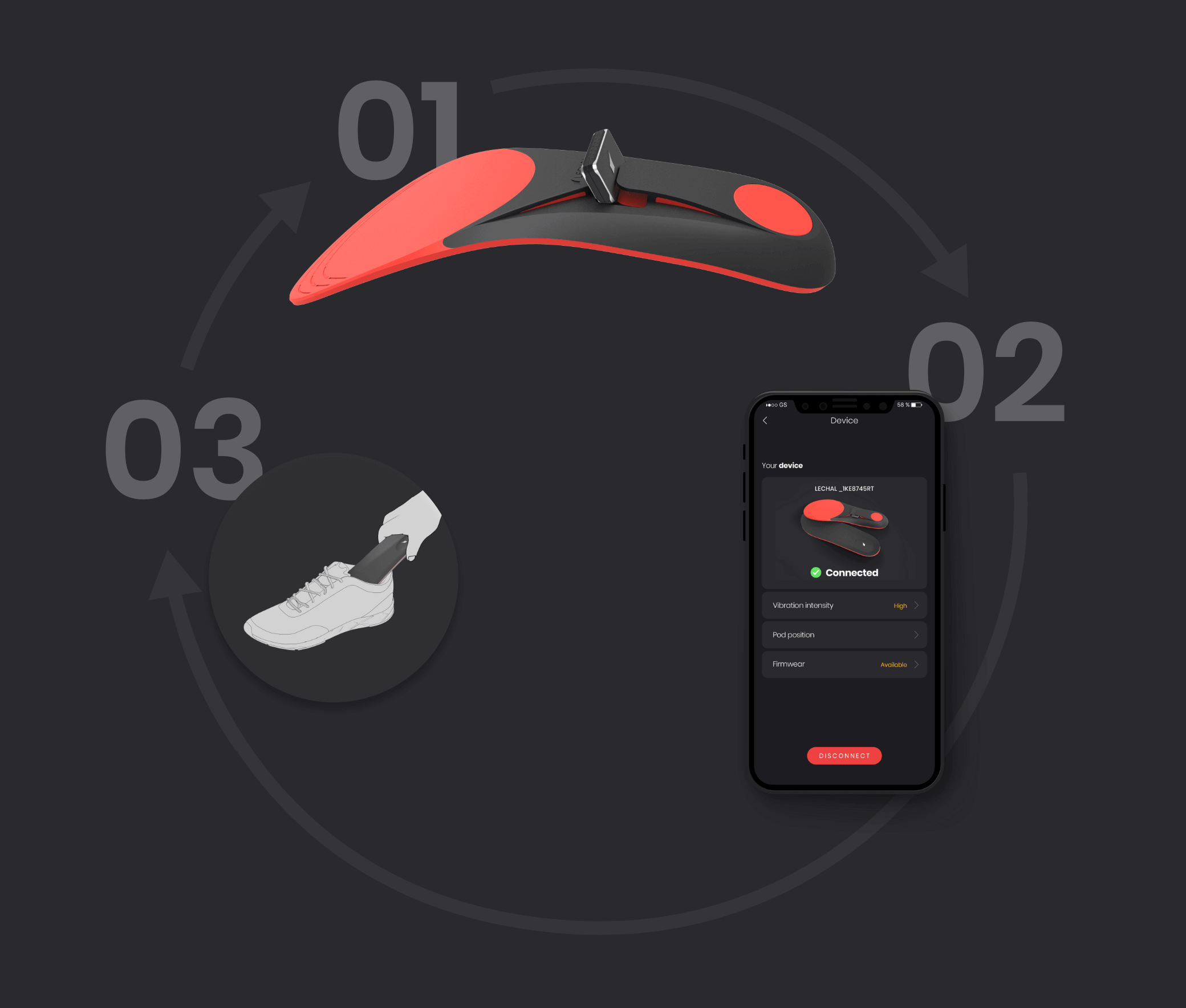 These minimal pods are the hub of the electronic sensors and vibration feedback. They constantly sync with the mobile app and make your insoles smart. Made with state-of-the-art material to provide extra long durability and water resistance.